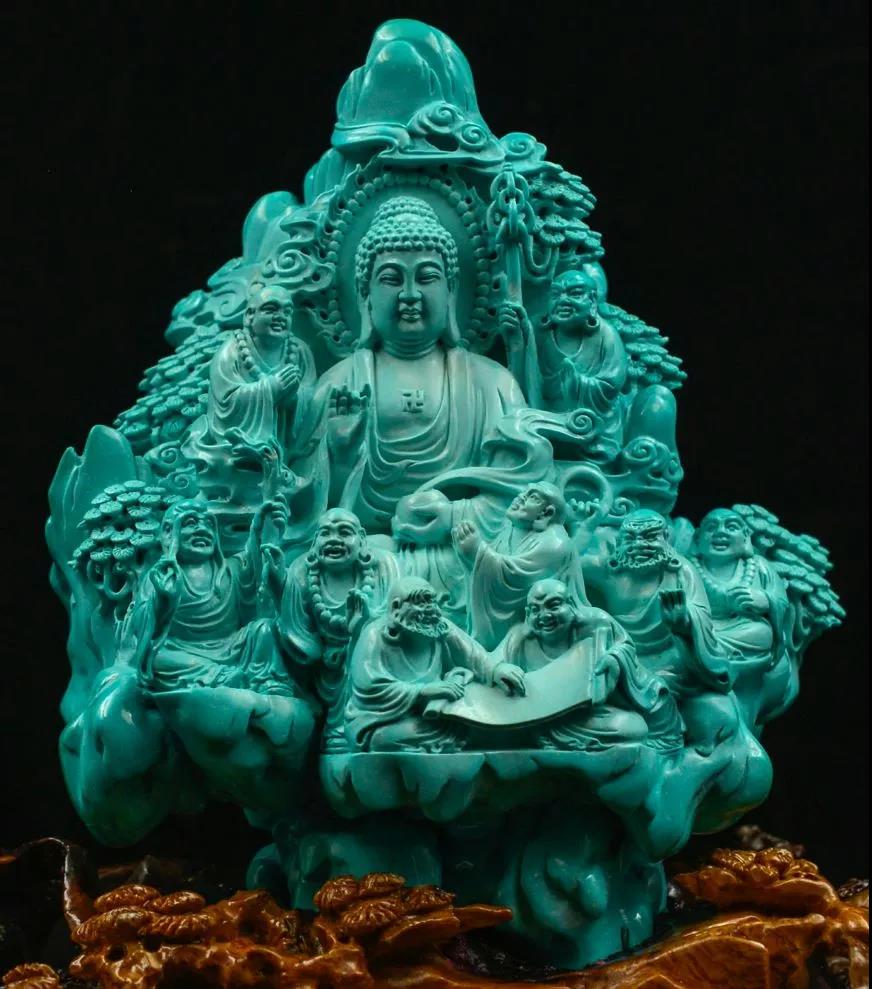 高瓷藍(lán)珍稀大料與大師匠心的高度融合,造就一件佛教藝術(shù)題材的松石玉雕經(jīng)典之作。作品細(xì)節(jié)生動(dòng)靈致,布局縝密,雕琢精巧。